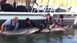 Join Jesse James and Great River Fishing Adventures as they land an incredible White Sturgeon double header. One of the fish is an astounding 400lbs.